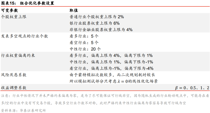4. 组合构建:以指数成分股作为股票池,剔除上市不满一年、调仓日换手率为零等无法交易的股票,应用组合优化模型求解个股权重(优化参数设置如下表)。