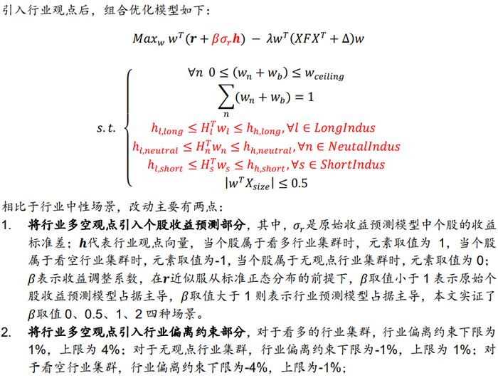 在行业中性状态下(也即不引入行业轮动观点),组合优化模型如下: