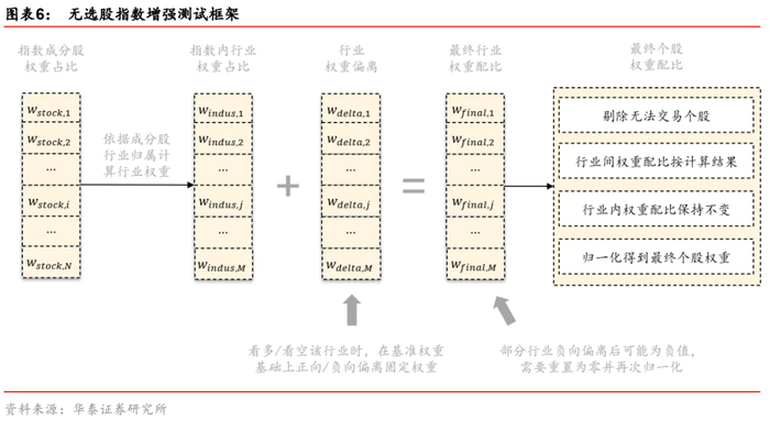 4. 组合构建:以目标指数(本文以沪深300和中证500作为研究对象)成分股作为底层资产,计算指数内行业基准权重;根据模拟行业轮动观点在看多/看空行业上正向/负向偏离固定比例(本文实证了1%、2%、3%三种参数);对于偏离后行业绝对权重小于零的,重置为零(也即不能做空),重新归一化,得到最终的行业间权重配比;行业内权重配比延续原始指数内的结果,也即不引入任何选股观点(但是需要剔除无法交易的个股);