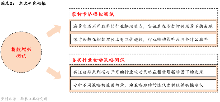 自本篇报告起,我们将聚焦于行业轮动策略的落地实证。不同于大类资产配置和选股模型,行业配置并没有直接可投资标的,模型观点只能下沉至股票或者主题基金进行落地。本文主要从指数增强的角度切入,实证行业轮动模型的表现。后文内容主要分为两部分:1、海量生成不同胜率的行业轮动观点进行模拟测试。在传统指数增强研究中,普遍认为引入行业轮动策略带来的超额收益,相比于承担的超额风险是不划算的,那么若想在指数增强上有显著超额表现,行业轮动策略应该具备什么胜率水平?这至少能为我们做策略开发提供实操指引;2、实证前期报告中开发的真实轮动模型在指数增强场景下的表现,核心是分析不同策略的适用场景,并且为策略的后续迭代更新提供实操建议。