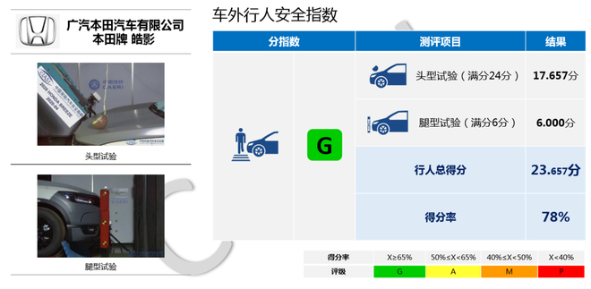 在车外行人安全指数方面,2020款皓影240TURBO CVT精英版头型试验得分为17.657分(满分24分)、腿型试验得分为6.000分(满分6分),总得分为23.657分(得分率78%),最终获得优秀(G)评价。