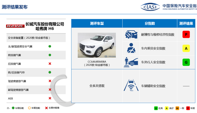 2020款哈弗H6铂金都市版测评结果显示,在代表低速碰撞下维修费用经济性的“耐撞性与维修经济性指数”项目获得差评(P),在车内成员安全指数上获得了良好(A),在车外行人安全指数和车辆辅助安全指数上获得了优秀(G)。