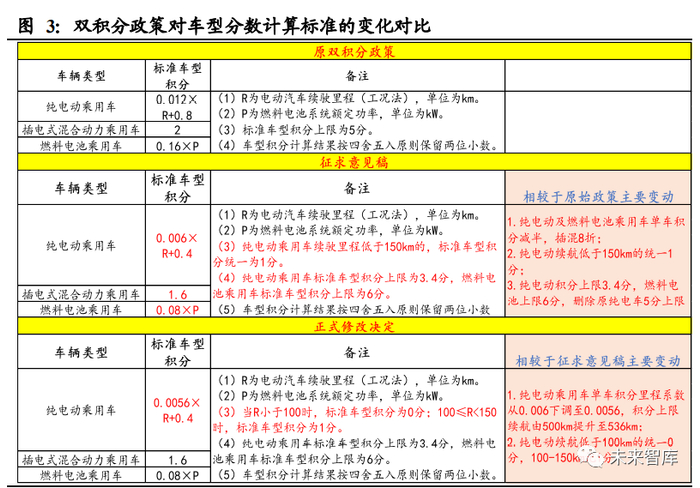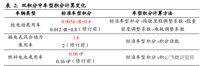 双积分修订版对单车积分值大幅向下调整。根据双积分修改版本,纯电动积分上限 3.4 分,删除原纯电车 5 分上限;纯电动乘用车单车积分里程系数从 0.012 下调至 0.0056,积分上限续航由 350km 提升至 536km;纯电动乘用车车型积分=标准车型 积分×续驶里程调整系数×能量密度调整系数×电耗调整系数;纯电动积分与续航里 程及能量密度挂钩,续航 300km,电池能量密度 125Wh/kg 可满足全额调整系数