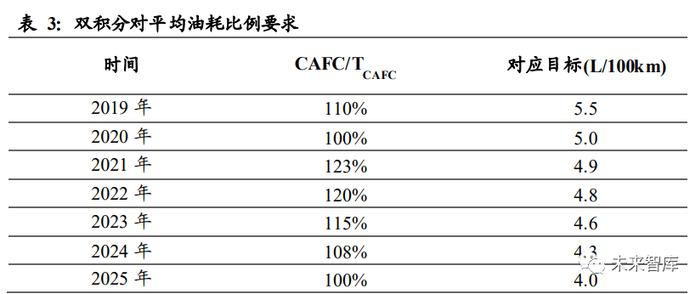 根据燃料消耗量标准对平均燃料目标值及年度考核比例做了进一步更新,明确了 2020-2025 年,企业平均目标油耗将要由 5L/100KM 降至 4L/100KM,降幅 20%。若 刨除新能源汽车,16-18 年燃油车的油耗降幅每年仅有约 2%,这意味着要满足油耗 要求必须发展新能源汽车。