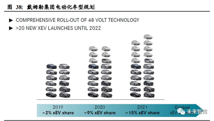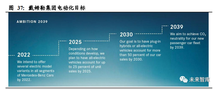 戴姆勒提出“2039 愿景”,到 2022 年,所有车型都提供电动款,预计将有 20 款以上;到 2025 年纯电动化车型占比 25%;2030 年 EV 及 PHEV 乘用车电动化率达到 50%;至 2039 年,实现乘用车碳中和。