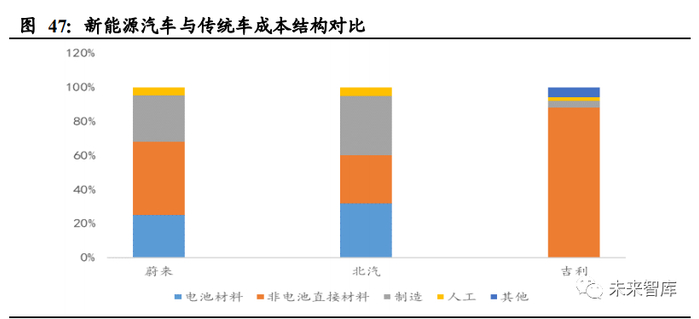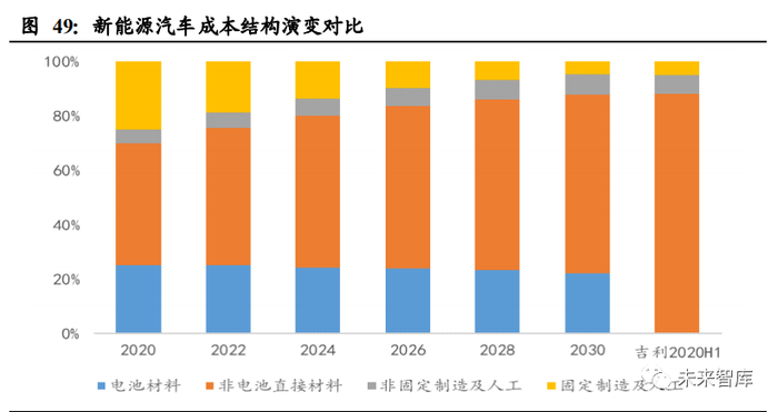 新能源汽车成本项中,电池大约占 20-30%,其他材料占比约 30-40%,制造费用占 比 25%,人工占比约 5%;传统车成本结构中,材料占比近 90%,制造约 4%,人工 约 2%。新能源汽车的产量规模导致其成本结构中有较高的固定成本项,传统汽车 如吉利年产百万级则其可变成本如材料等占比近 9 成,未来随着新能源汽车产量增 加,固定成本项有望进一步摊薄,降低成本。
