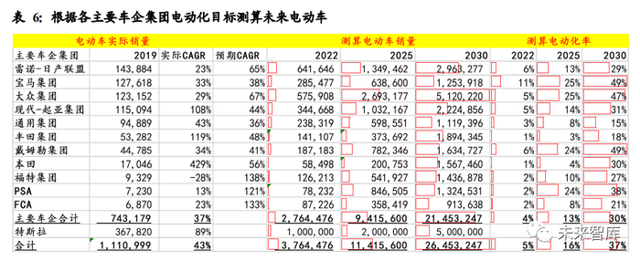 测算得知,绝大部分车企的新能源汽车 CAGR 将超过 40%,较之前各国的目标规划 目标更为激进,一方面这表达了一种电动化大势的决心,一方面也由于车企的电动 化目标相对于政策目标执行力会更弱。