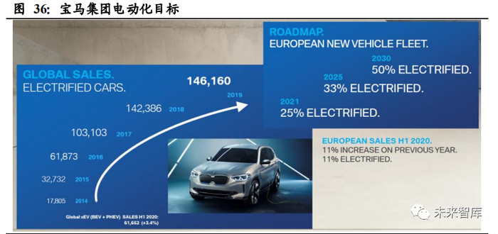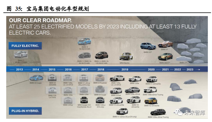 宝马集团到 2025 年,电动汽车的销售量每年将增长 30%以上;2023 年之前至少推 出 25 款电动车型,其中至少 13 款为纯电动汽车。2021 年 25% 是电动车 (BEV/PHEV/HEV),2025 年为 33%,2030 年为 50%,到 2030 年 10 年内销售 700 万电动车,其中 2/3 为 BEV 车型。