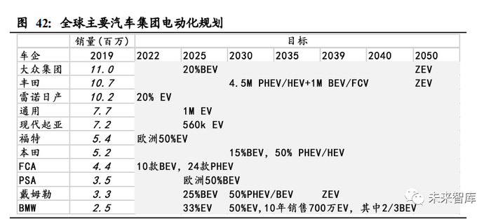 全球销量靠前的主要传统车企均有明确的新能源汽车规划目标,大部分车企将目标 时点定在 2025 年及 2030 年,与前文所述的大部分国家战略目标相匹配。