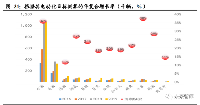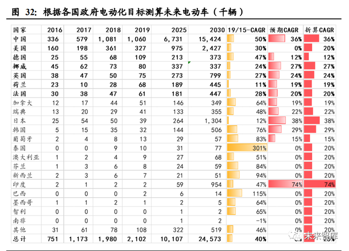 根据各国设定的电动化目标,结合 2017-2019 年当期汽车销量,假设未来以此销量 年平均数为基础,测算在电动化目标年份下相应的新能源汽车销量。以此测算结果 结合现阶段电动车销量,测算相应的目标年复合增速。