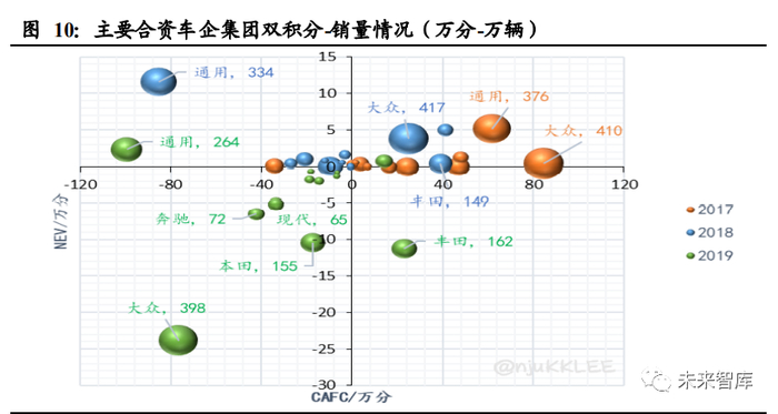以合资车企的角度分析,2019 年大部分合资车企集团 NEV 积分及 CAFC 积分加速 转负,大众及通用两大巨头加速向第三象限转移。