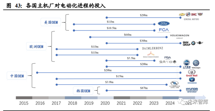 各主机厂均在电动化投资额度上不断加强,比较大的投资包括现代起亚集团约 870 亿项目中布局电动化,大众集团约 660 亿美元项目中布局电动化。中美欧主机厂均 有较大投入,美国主机厂布局约 415 亿美元,欧洲主机厂布局约 1235 亿美元,中 国主机厂布局约 589 亿美元,韩国主机厂布局约 870 亿美元。