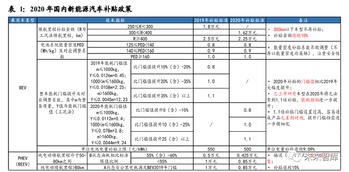 2020 年 4 月,财政部、工信部、科技部、发改委等宣布,综合技术进步、规模效应 等因素,将新能源汽车推广应用财政补贴政策实施期限由原定的 2020 年底延长至 2022 年底。平缓补贴退坡力度和节奏,原则上 2020-2022 年补贴标准分别在上一年 基础上退坡 10%、20%、30%。相较于 19 年实际退坡 70%更为缓和,利于引导产业 预期。不调整能量密度要求,提高能耗、续驶里程门槛,也对过去诟病的问题进行 了修正。