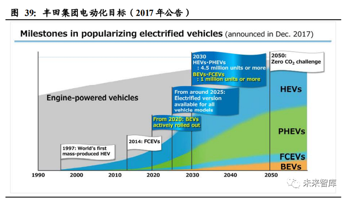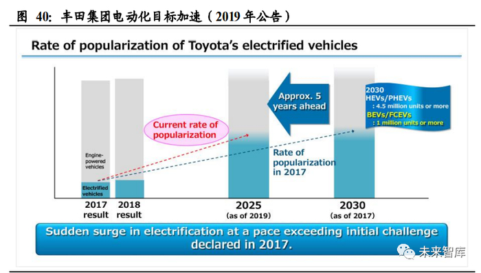 丰田在 2017 年宣布,预计到 2030 年,其新型电动汽车的销量将超过 550 万辆,其 中混合动力和插电式混合动力合计 450 万辆或更多,BEVs 和 fcev 合计超过 100 万 辆。之后丰田将此计划进一步更新,提前 5 年即到 2025 年完成该目标。