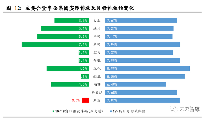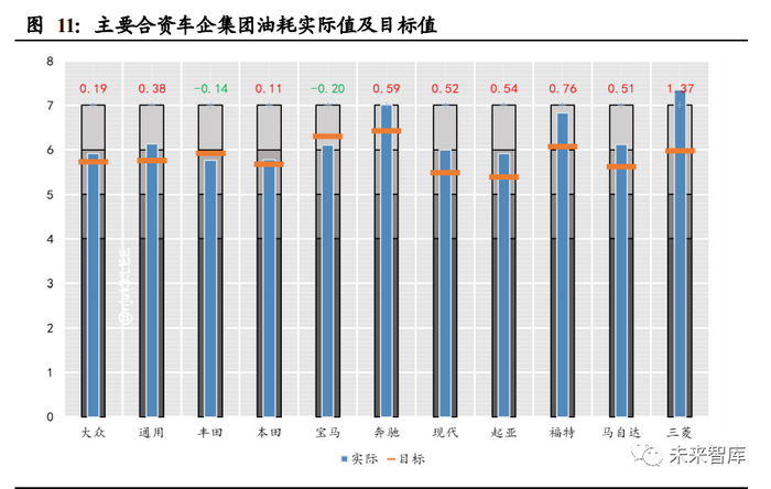 从实际油耗降低看,仅有丰田及宝马达标,其余合资集团全部不达标。销量排名前 二的大众、通用,油耗实际值较目标值分别高出约 0.19L/100km,0.38L/100km,其 余大部分车企也在 0.5L/100km 以上的差距,显示油耗负积分压力巨大,传统降低油 耗的方法很难满足大车企的油耗降低目标,合资车企集团的实际油耗降低进度也远 低于目标油耗降低速度,唯有加速电动化可解决问题。
