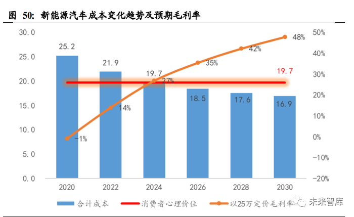 消费者层面:考虑到目前电动车较传统车贵约 45%,则 25 万左右的电动车对应燃 油车约为 17.2 万元,再考虑 2.5 万的可接受溢价,即消费者的心理价位约为 19.7 万 元,预计 2024 年左右车企将在成本上首次满足消费者的心理预期线。