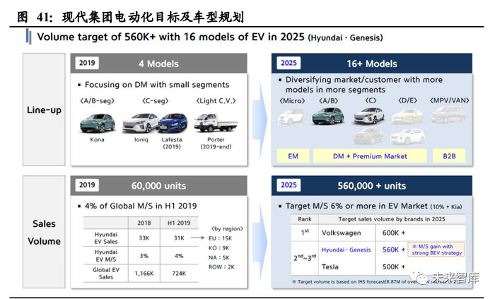 现代集团计划到 2025 年推出 16 款电动车,合计销售超过 56 万辆 EV,预计将在 EV 市场中占据 6%以上份额,算上起亚,现代集团目标是 EV 市占率达到 10%,合计 售出约 100 万辆电动车。
