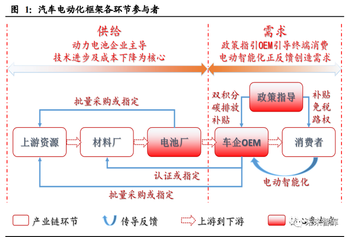 若以电动化最核心的零部件—动力电池—为分析入口,则电动化进程的参与方,可 以分为供给侧和需求侧。供给侧包括上游资源、材料厂、电池厂等,需求侧包括消 费者、车企 OEM、政策制定者等。