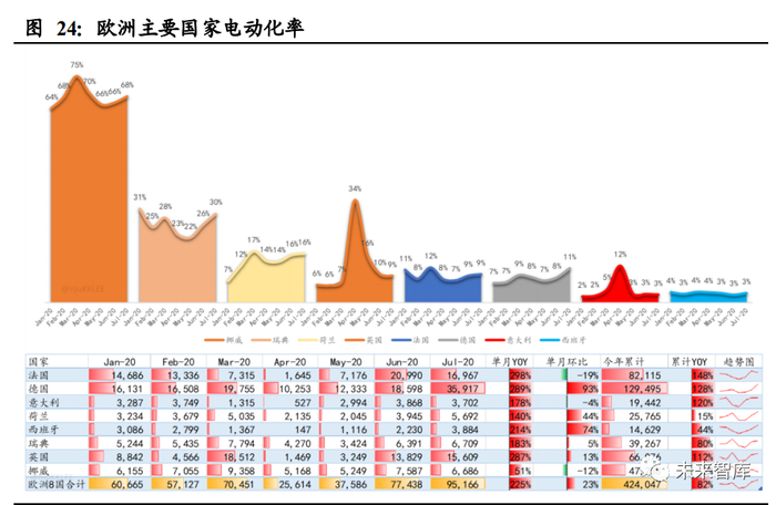 2020 年 7 月,法国的电动车在乘用车市场份额从 2019 年 7 月的 2.5%上升到 9.5%。7 月,法国乘用车新车注册量为 178,982 辆,同比变化为 4%;法国新能源汽车 (BEV+PHEV)销量为 16,967 辆,同比变化为 298%,环比变化为-19%,当月渗透 率为 9.5%,全年累计新能源汽车销量为 82,115 辆,同比变化为 148%,全年累计渗 透率为 9.2%;