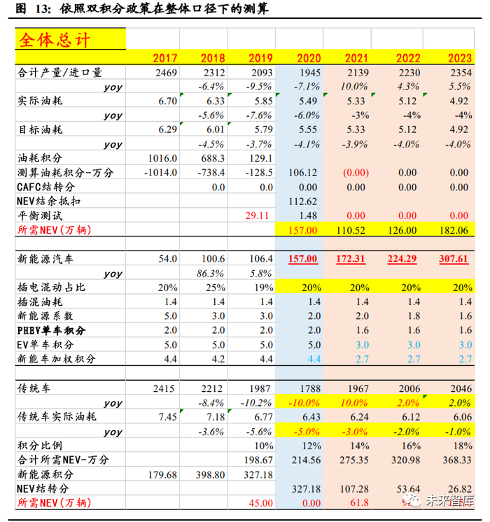 2) 大部分车企双积分压力逐步增加,在传统燃油车油耗难以降低的情况下,仅有 靠加大新能源汽车的销售量才能满足双积分需求,预计 2023 年需要 400 万辆 新能源乘用车满足需求。