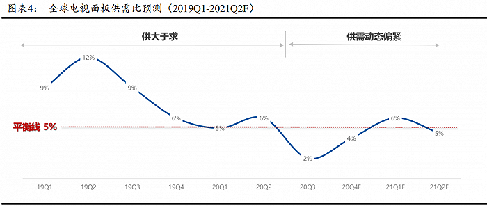 综合供需两方面的因素,根据奥维睿沃的预测,2021年上半年电视面板整体供需仍然持续偏紧,预计20Q1供需略高于市场平衡线,20Q2受下游需求带动,供需将略低于市场平衡线。