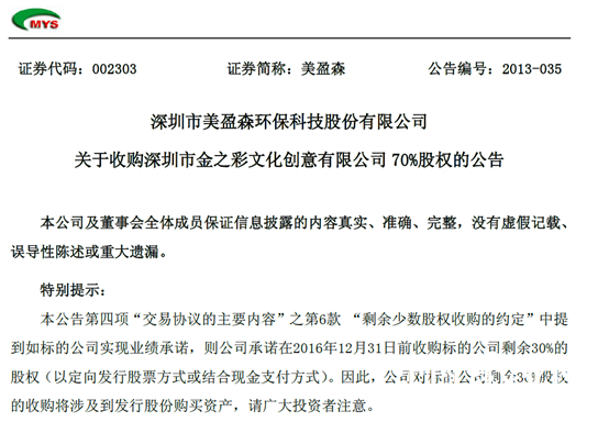 此外,对于之后的款项,协议中列出了业绩保障,即收购完成后的当年度,金之彩净利润不低于3300万元;收购完成后,2014年度、2015年度标的公司净利润相比前一年度分别增长不低于30%,且2014年度标的公司净利润不低于4290万元、2015年度标的公司净利润不低于5577万元。