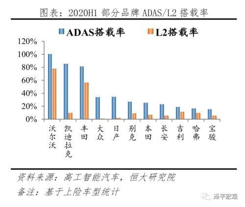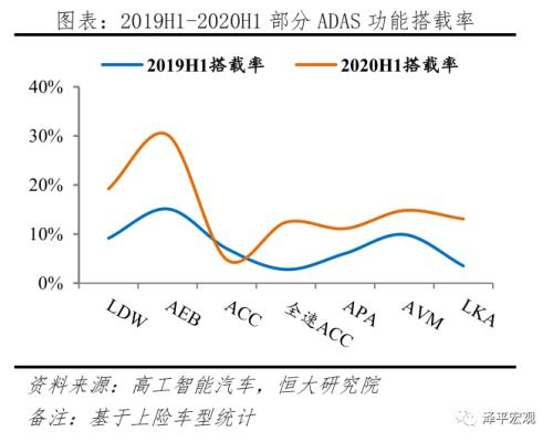 据高工智能汽车统计,2020H1中国部分品牌,如沃尔沃、凯迪拉克、丰田、长安、吉利汽车(港股00175)新车ADAS搭载率分别为100.0%、85.0%、81.0%、22.8%、18.5%,其中新车达到L2级别占比分别为77.6%、9.3%、56.3%5.5%、11.1%;不同品牌车型智能化水平差别较大。ADAS代表功能方面,据高工智能汽车统计,2020H1中国乘用车部分ADAS功能,如LDW(车道偏离预警)、AEB(自动紧急制动)、ACC(自适应巡航控制)、全速ACC、APA(自动泊车辅助)、AVM(全景影像监测)、LKA(车道保持辅助)搭载率分别为19.2%、30.2%、4.8%、12.4%、11.1%、14.8%、13.1%;相比2019H1均有较大提升,渗透明显提速。