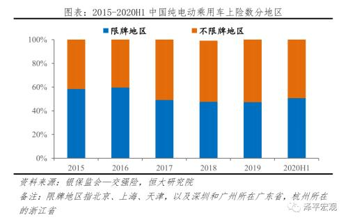 限牌地区销量占比呈下降趋势,市场化因素加强。据乘用车交强险数据统计,2015-2020H1我国限牌地区新能源乘用车上险数占比分别为58.6%、59.8%、49.2%、47.6%、47.4%、50.8%,整体呈下滑趋势。2020H1由于疫情因素,限牌地区销量占比短暂提升。