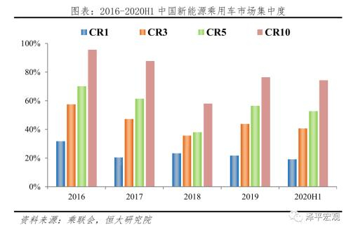 造车新势力发力,市场竞争加剧,集中度下降。从市场集中度来看,2020H1中国新能源乘用车第1名、前3名、前5名、前10名占比分别为19.0%、40.5%、52.6%、74.3%;相比2016年31.6%、57.3%、70.1%、95.6%,分别下降12.6、16.8、17.5、21.3个百分点。从下表可以看出,比亚迪、上汽、北汽三家老牌车企市场地位稳固;其余厂商排名波动明显,如江淮、知豆曾一度占据市场第3,如今市场份额不到1%;而造车新势力表现亮眼,2020年上半年特斯拉、蔚来、理想、威马、合众、小鹏销量排名分别为第2、7、13、14、19、20。