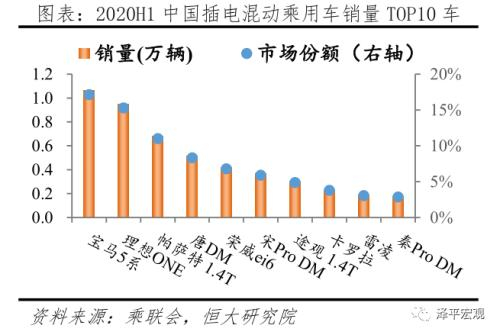 据乘联会统计,2020H1我国插电混动乘用车销售6.2万辆,TOP10车型分别为宝马5系PHEV、理想ONE、帕萨特1.4TP HEV、比亚迪唐DM、荣威ei6、比亚迪宋Pro DM、途观1.4T PHEV、卡罗拉PHEV、雷凌PHEV、比亚迪秦Pro DM,对应市场占比分别为17.1%、15.3%、11.0%、8.3%、6.8%、5.9%、4.9%、3.8%、3.1%、2.9%,合计占比79.0%;其中宝马5系、理想ONE占比超过15%,插电混动畅销车型外(合)资占有5款。