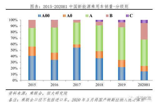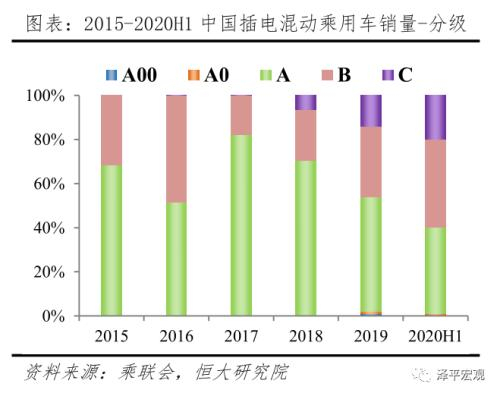 新能源乘用车高端化、大型化趋势明显。据乘联会统计,2020H1中国新能源乘用车共销售32.9万辆(乘联会数据前后一定微调,与上文31.3万辆有些许差异),A00、A0、A、B、C级车分别销售4.9、3.0、14.4、9.0、1.6万辆,对应占比15.0%、9.0%、43.7%、27.3%、5.0%;其中A00车型占比从2017年54.4%持续下降到2020H1的15.0%,B级车占比从2017年4.3%持续提升到2020H1的27.3%,市场高端化趋势明显。其中2020H1纯电动乘用车A级车和B级车分别占比44.9%、23.9%,相比2015年分别提升34.5、21.1个百分点;B级车份额提升主要源于特斯拉Model 3和蔚来ES6。2020H1插电混动乘用车B级车和C级车分别占比39.9%、19.8%,相比2015年分别提升8.4、19.8个百分点;C级车份额提升主要源于宝马5系 Le和保时捷卡宴PHEV。