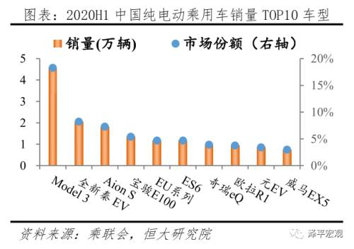 据乘联会统计,2020H1我国纯电动乘用车销售25.0万辆,TOP10车型分别为Model 3、全新秦EV、Aion S、宝骏E100、北汽EU系列、蔚来ES6、奇瑞eQ、欧拉R1、比亚迪元EV、威马EX5,对应市场占比分别为18.3%、8.2%、7.3%、5.4%、4.7%、4.7%、3.9%、3.7%、3.4%、3.0%,合计占比62.5%;其中特斯拉Model 3一枝独秀,占比超过二、三名之和。