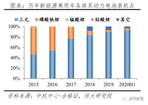近年来我国动力电池技术取得巨大进步,尤其是电池系统能量密度和材料体系改善显著。据工信部推荐目录统计,纯电动乘用车型电池系统平均能量密度从2017年第1批104.3Wh/kg,持续提升到2020年第7批的152.6Wh/kg,三年半时间平均能量密度提升46.3%,极大缓解了里程焦虑。据中机中心合格证统计,2020H1我国新能源乘用车动力电池装机量13.2GWh,其中三元、磷酸铁锂分别为12.2、0.5Gwh,对应占比92.3%、4.0%。我国新能源乘用车三元体系动力电池装机比例从2015年46.1%持续提升到2020H1的92.3%,份额翻倍。值得注意的是,2020H1磷酸铁锂份额(4.0%)相比2019年(4.1%)基本保持稳定,没有出现进一步下滑;主要原因在于三元材料尤其是高镍体系仍面临安全问题,下半年随着比亚迪汉搭载LFP刀片电池上市,LFP动力电池装机量占比预计会有所回升。