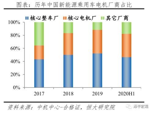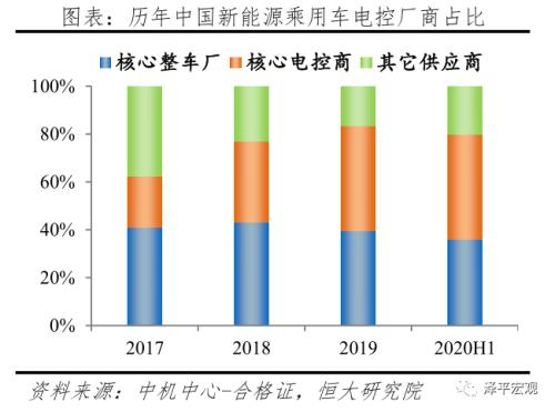 电控供应商按照背景也可细分成:核心整车厂、核心电控商、其它供应商。据中机中心合格证数据统计,2020H1我国新能源乘用车电机合计配套34.9万套,其中核心整车厂、核心电控厂、其它厂商市场占比分别为36.2%、43.6%、20.1%;从近几年趋势看,核心电控厂市场份额从2017年21.2%提升到2020H1的43.6%,增加22.4个百分点。