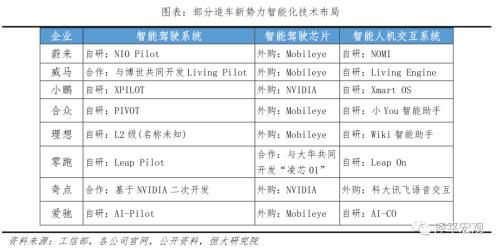 当前我国计算平台供应商尚处于商业化初期阶段,其实际应用效果还需客户验证;故当前国内自动驾驶芯片基本还是完全外购。以部分造车新势力为例,如下表所示,智能驾驶系统和智能人机交互系统都可以自研,但是智能驾驶芯片基本被Mobileye和 NVIDIA垄断。