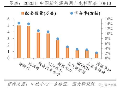 电机控制器是新能源汽车中连接电池与电机的电能转换单元。据中机中心合格证数据统计,2020H1我国新能源乘用车电控合计配套34.9万套,配套量TOP10厂商分别为特斯拉、比亚迪、联合汽车电子、汇川技术、蔚然动力、北汽新能源、BOSCH、上海电驱动、博格华纳、德尔福,对应市场占比分别为14.3%、14.0%、11.2%、10.7%、7.9%、4.6%、3.6%、3.4%、2.1%、2.1%,合计占比73.8%;其中本土厂商前10名占有6席,合计占比51.8%。