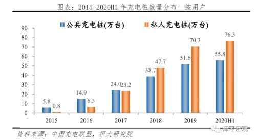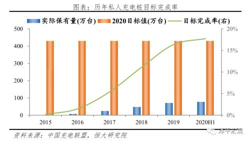 2015年10月,发改委、工信部等五部委联合发布《电动汽车充电基础设施发展指南(2015-2020)》,规划至2020年我国将新增集中式充换电站超过1.2万座,分散式充电桩超过480万,其中公共桩50万、私人桩430万,以满足全国500万辆电动汽车充电需求。据中国充电联盟统计,截至到2020年6月,我国公共充电桩保有量55.8万台,目标完成率111.6%;私人充电桩保有量只有76.3万辆,完成率17.7%,远低于预期。