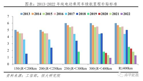 3)财政补贴:补贴自2017年开始明显退坡,2019年加速退坡,原计划于2020年退出的补贴政策,因市场销量不及预期及疫情影响,延长2年至2022年。从2013年至今,工信部联合其他部委先后发布7份新能源汽车购置补贴通知文件,5次调整财政补贴标准引导市场走向:以R≥400km纯电动乘用车为例,2013、2014、2015、2016、2017、2018、2019、2020、2021、2022里程补贴标准分别为6、5.7、5.4、5.5、4.4、5、2.5、2.25、1.8、1.26万元。
