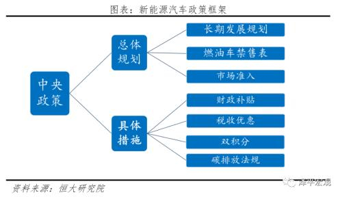 新能源汽车产业相关政策可分为两大类:总体规划和具体措施。其中总体规划又可细分成,长期发展规划、燃油车禁售时间表、市场准入;具体措施亦可细分成,财政补贴、税收优惠、双积分、碳排放法规。