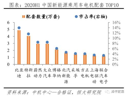 据中机中心合格证数据统计,2020H1我国新能源乘用车电机合计配套34.9万套,其中配套数量TOP10厂商分别为:比亚迪、特斯拉、蔚然动力、大众汽车、博格华纳、北汽新能源、采埃孚、方正电机、上海电驱动、联合电子,对应装机套数占比分别为14.0%、、11.6%、8.5%、8.5%、6.1%、4.6%、4.1%、4.1%、3.6%、3.4%,合计占比68.3%;本土厂商前10名占有6席,合计占比38.2%。