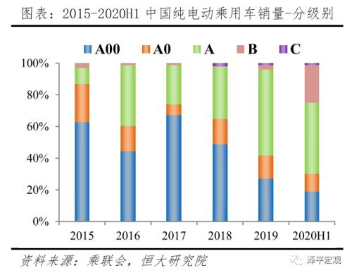 变革之二:供给升级激发新的消费需求,行业整体销量下滑但私人消费占比提升,行业从高速发展迈向高质量发展。1)行业整体销量下滑:随着2019年6月后补贴全面退坡,行业销量出现断崖式下滑,据乘联会统计7至12月销量48.5万、同比下滑28%,全年销量102.5万、仅微增3.2%。2020年上半年叠加疫情冲击,新能源乘用车销量仅31.3万辆、同比下滑44%。2)疫情期间私人消费表现亮眼:2020H1新能源乘用车私人消费占比71.7%,相比2019年增加18.9个百分点。3)新能源乘用车大型化、高端化趋势明显:A00车型占比从2017年54.4%持续下降到2020H1的15.0%,B级车占比从2017年4.3%持续提升到2020H1的27.3%。