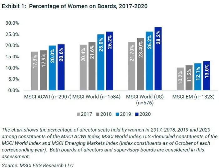 在MSCI全球指数(MSCI World Index)中,达到至少有三名女性董事这一门槛的公司占比出现显著上升——从2019年的51.1%上升到2020年的57.6%。