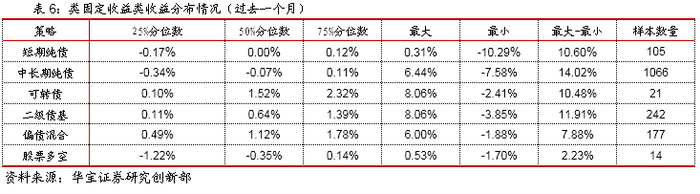 对于固定收益策略,过去一个月来看,货币、短期纯债以及中长期纯债分别录得收益率0.17%、-0.26%、-0.17%,从样本基金分布来看,短期纯债收益中位数为0.00%,区间范围为-10.29%到0.31%,中长期纯债收益中位数为-0.07%,区间范围为-7.58%到6.44%,中长期纯债基金收益差距较大,短期纯债表现相对平均,总体来看货币基金的平均收益更优。从过去一年来看,中长期纯债表现相对占优,但短期纯债回撤更小,收益风险比更优。