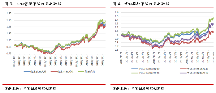 对于主动管理策略,过去一个月来看,稳定大盘风格、稳定小盘风格以及灵活风格分别录得收益率2.05%、2.61%、0.95%,从样本基金分布来看,稳定大盘风格基金收益中位数为2.30%,区间范围为-12.38%到13.58%,稳定小盘风格基金收益中位数为2.31%,区间范围为-8.44%到20.30%,灵活风格基金收益中位数为1.64%,区间范围为-11.36%到18.98%,从主动管理型基金不同风格收益情况来看,过去一个月,稳定大盘与稳定小盘均收益相近;过去一年稳定小盘的收益更高,但是最大回撤也更大,整体来看稳定大盘的收益风险比更高。