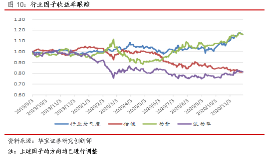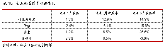 我们主要跟踪4类因子,行业景气度因子、估值因子、动量因子与波动率因子。长期来看,行业景气度因子与动量因子为正向因子,即行业景气度越高或动量趋势越强,下期该行业表现优异的概率越高;而估值因子与波动率因子为反向指标,即估值所处分位数越低或波动率越小,下期该行业表现优异的概率越高。