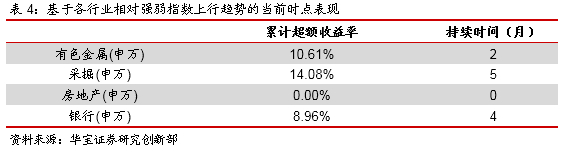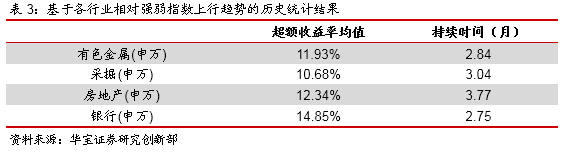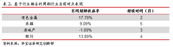 从以上统计结果可以看到,几个周期性行业在历史上的平均持续时间在4到5个月,超额收益率来看,有色金属和采掘的收益率相对更高,而银行、地产的超额涨幅相对低一些。