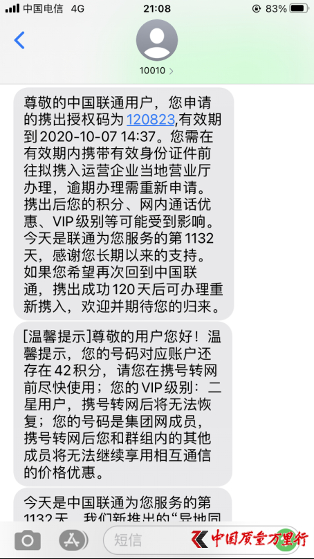 在许昌读大学的小章也发来投诉,此前他一直使用学院联通校园卡,因套餐费不合适,今年10月初在联通营业厅表示许可并办理业务情况下更换电信卡。