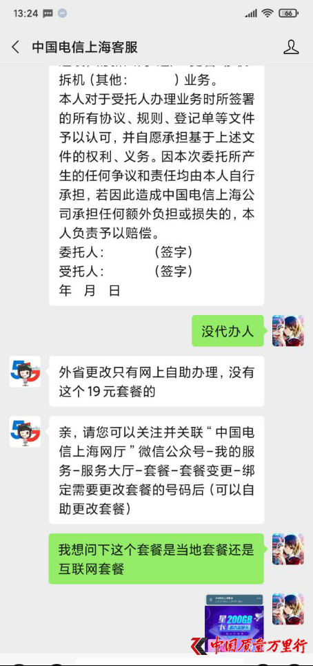 前不久,蒋女士在中国质量万里行消费投诉平台上投诉称,今年9月,她办理了携号转网电信39元套餐,后看到电信有其他更优惠的套餐,咨询电信微信客服进行套餐修改,但客服推荐的19元的套餐必须到上海营业点才能更改,因为蒋女士身在异地,不可能回上海只为改套餐。