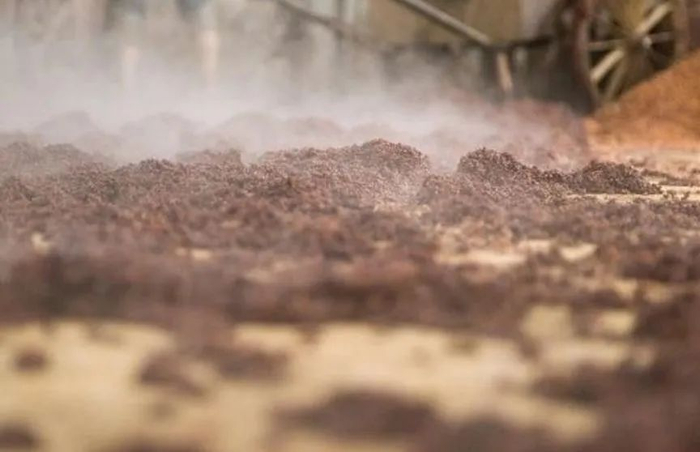 红缨子糯高粱被碾碎、蒸熟后,会按一定比例拌入曲粉,堆积发酵。