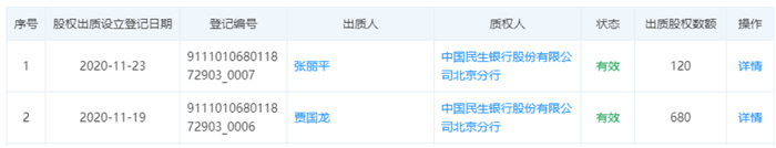 天眼查显示,贾国龙持股85%的北京西贝餐饮管理有限公司曾于近日新增两条股权出质信息,其中,贾国龙出质股权数额为680,张丽平出质股权数额为120。